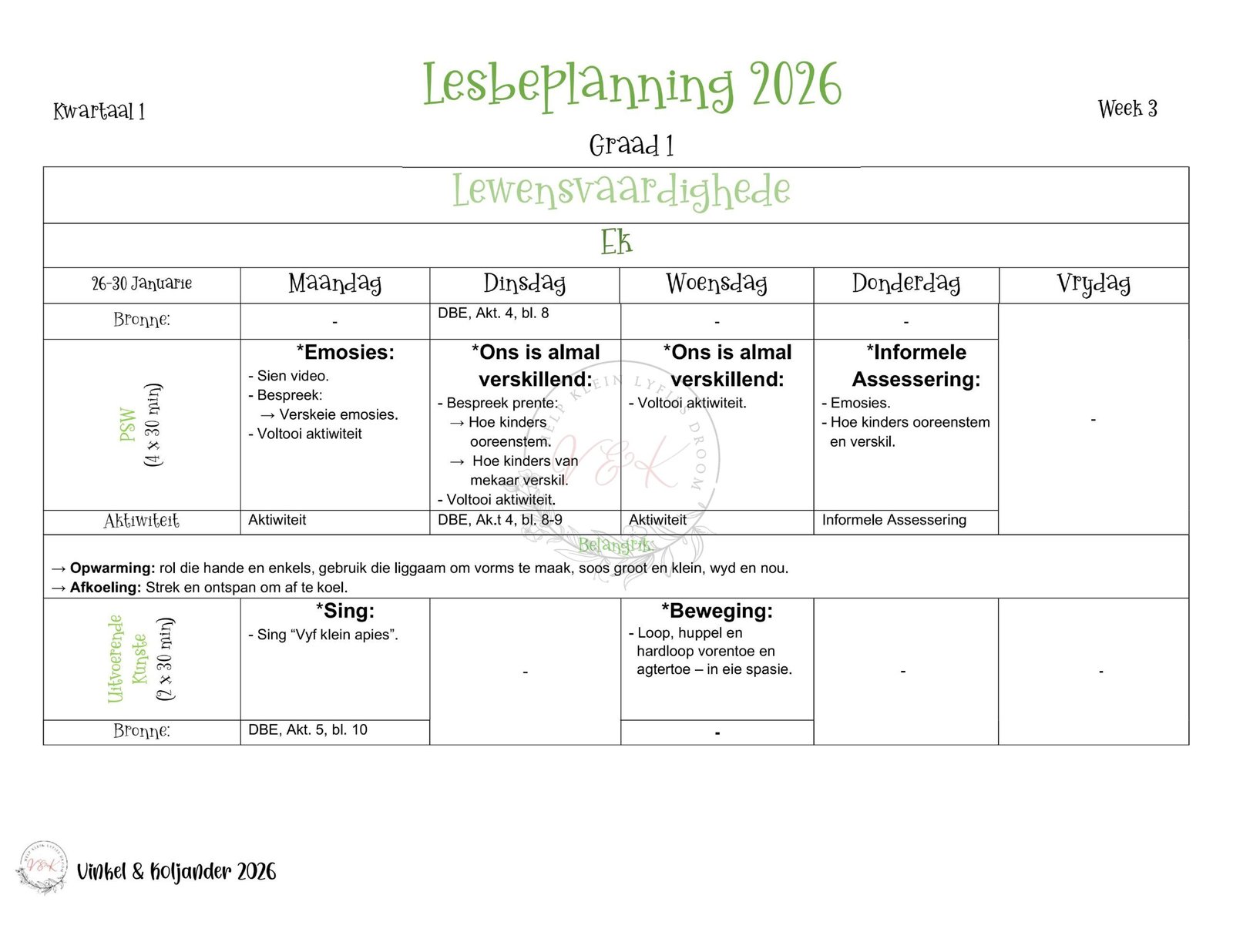 Graad 1 Lewensvaardigheid Lesbeplanning – Kwartaal 1 2026