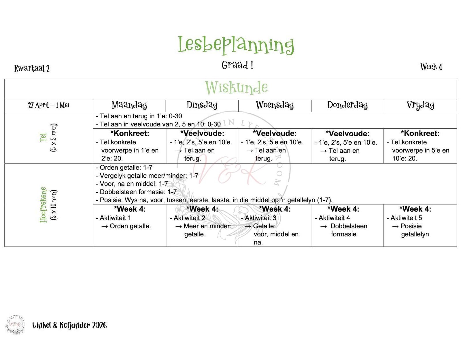 Graad 1 Wiskunde Lesbeplanning – Kwartaal 2 2026