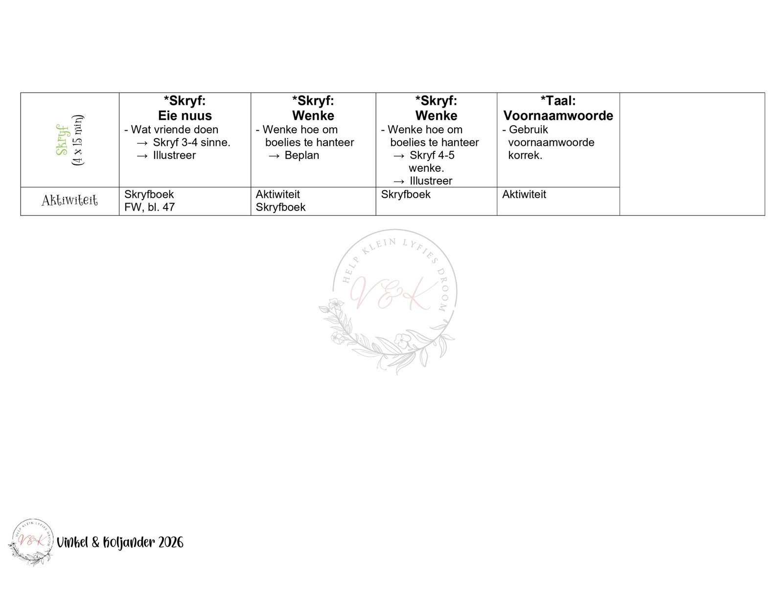 - Daaglikse lesse opgedeel in weeklikse lesbeplanning wat strek oor 10 weke.