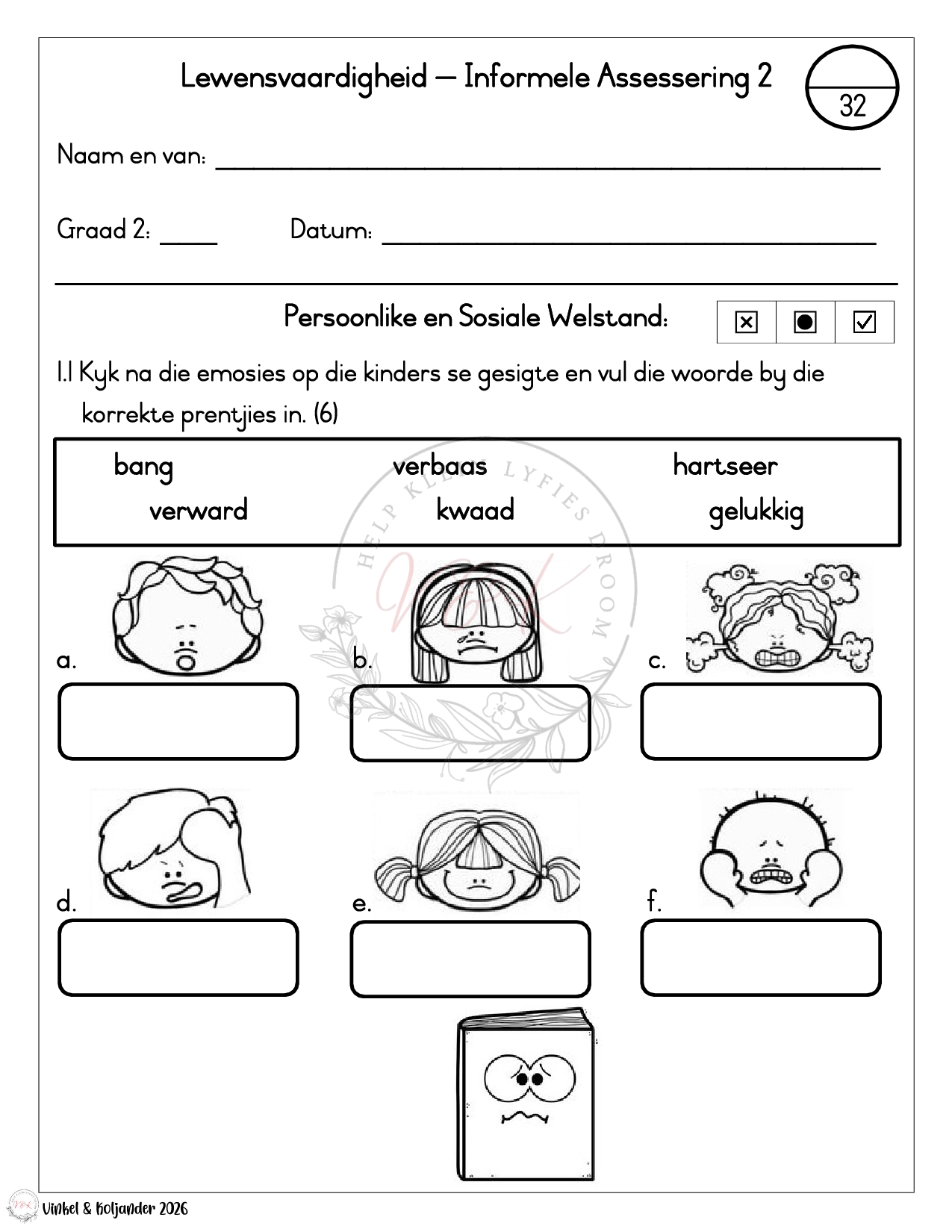 Graad 2 Lewensvaardigheid Informele Assessering – Kwartaal 1 2026 Die Informele Assesserings is opgestel volgens die uitkomste van die ATP en V&K se lesbeplanning. * Die pakket sluit in: Vier Informele Assesserings.